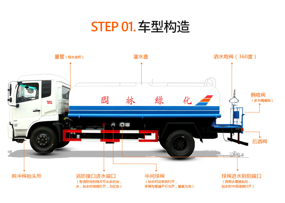 | 其它 | 1.罐體總容量為9.71立方米,罐體有效容積:9.25立方米,此車型僅選用3950mm軸距底盤,罐體外形尺寸(長×長軸×短軸)為(mm): 4300×2150×1520; 2、側防護及后下部防護裝置均采用Q235B材質,均采用螺栓連接,后下部防護尺寸:150×50(mm),離地面高度480mm。4、ABS系統生產廠家,型號 :焦作博瑞克控制技術有限公司,J ABS。5、可選裝弧形噴霧,箭頭燈。選裝底盤附件安裝位置。6、專用裝置:罐體,主要用于灑水及園林綠化。選裝后平臺外觀,隨底盤選裝燃油箱,電瓶,尿素罐,儲氣筒左右安裝位置,選裝新款輪罩外觀樣式。選裝罐體外觀樣式。選裝新款整車外觀樣式。 | ||