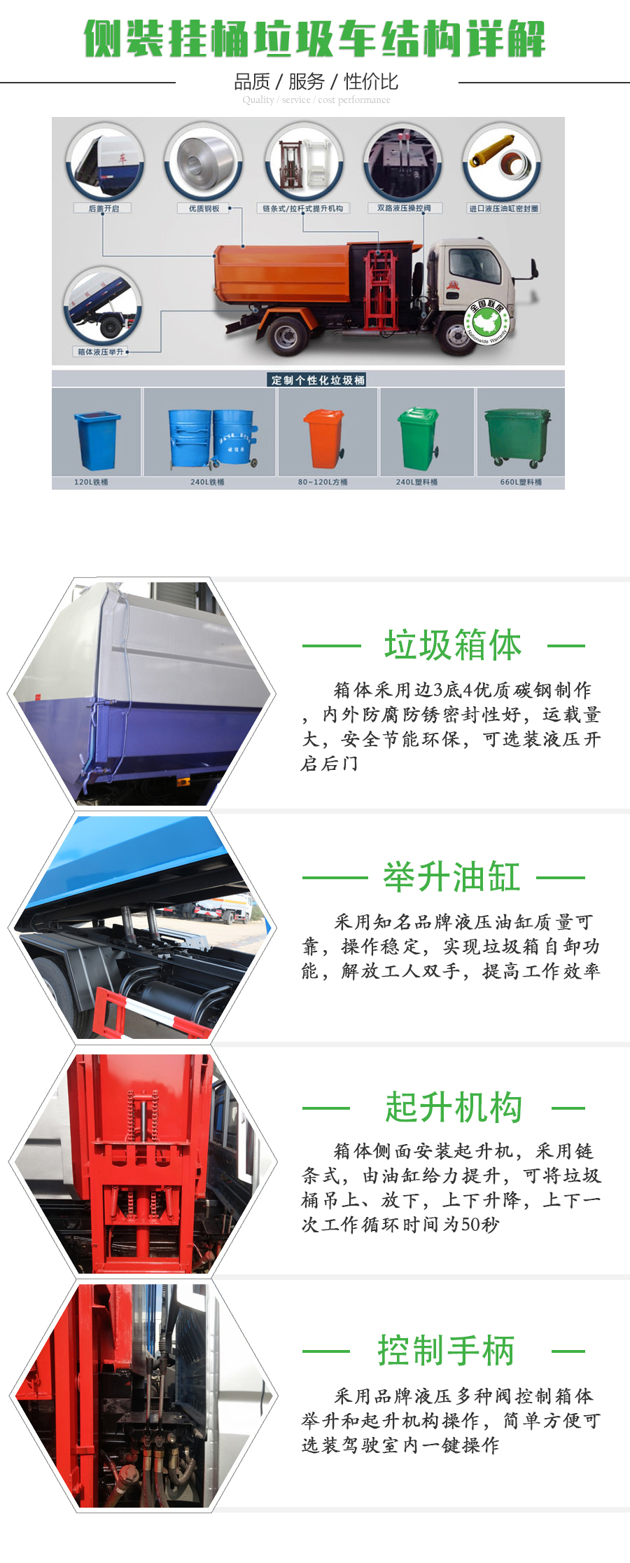 掛桶式垃圾車(自裝卸式垃圾車)是由密封式垃圾廂、液壓系統、操作系統組成,可配套全國通用鐵桶和塑料桶。一臺車能配幾十個垃圾桶,能實現車、桶聯合作業,循環運輸,自動提升架可將垃圾桶吊上、放下,上下升降,上下一次工作循環時間為60S,密封式廂體環保衛生,可避免二次污染。