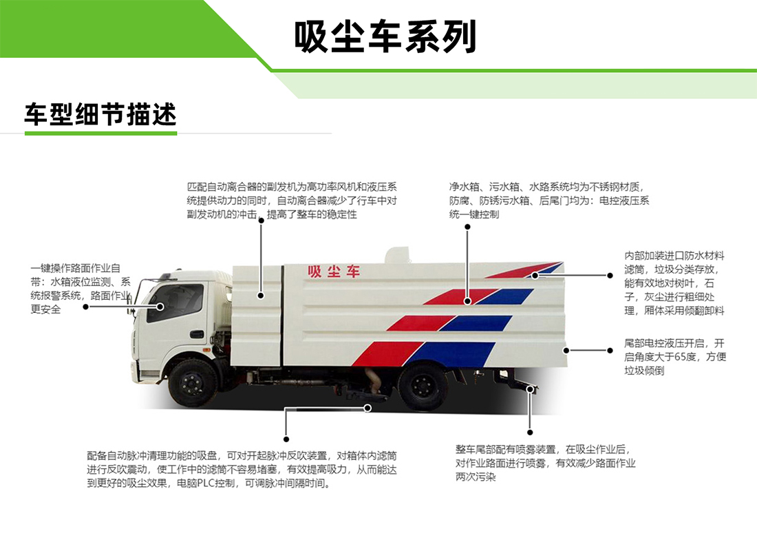 東風小多利卡5方吸塵車專用配置:塵箱:4立方米,水箱:1立方米;中置吸盤、江鈴五十鈴副發動機、施耐德控制開關、海普瑞斯電磁閥組、無級變速自動離合器、免維護離心式風機、高精度垃圾箱過濾系統(最高可達0.5微米),不銹鋼垃圾箱、進口脈沖閥、垃圾箱舉升自卸、尾部LED箭頭燈、車尾霧狀噴水潤濕功能、倒車影像、手動泵應急系統。